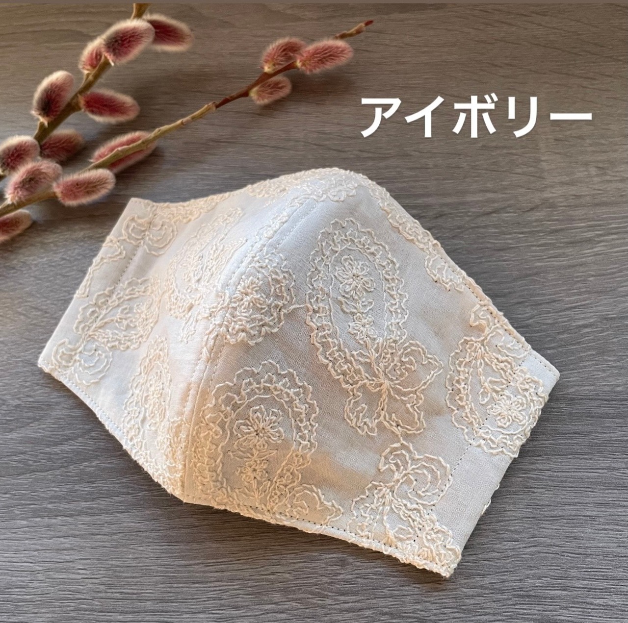 京都のレース屋さんで見つけた淡い色合いのペイズリー刺繍マスクです。