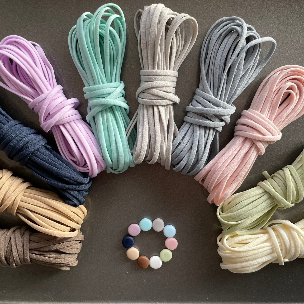 耳が痛くなりにくい細目の平ゴムに調整できるシリコンストッパーをお付けいたします。